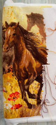Вид у вышивки "замученный", но думаю, когда постираю после отшива, все будет хорошо:)  По верхней отшитой полоске можно оценить сколько еще осталось поработать над лошадками, думаю к Новому году не успею, ну если только к китайскому:)))